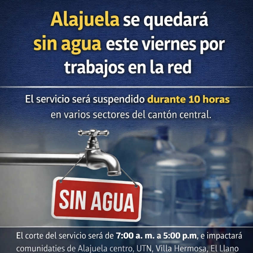 Vecinos del cantón de Alajuela enfrentarán una suspensión del servicio de agua potable este viernes desde las 7:00 a. m. y hasta las 5:00 p. m., debido a trabajos de mejora en la red de distribución que abastece el distrito central, según informó la Municipalidad de Alajuela.