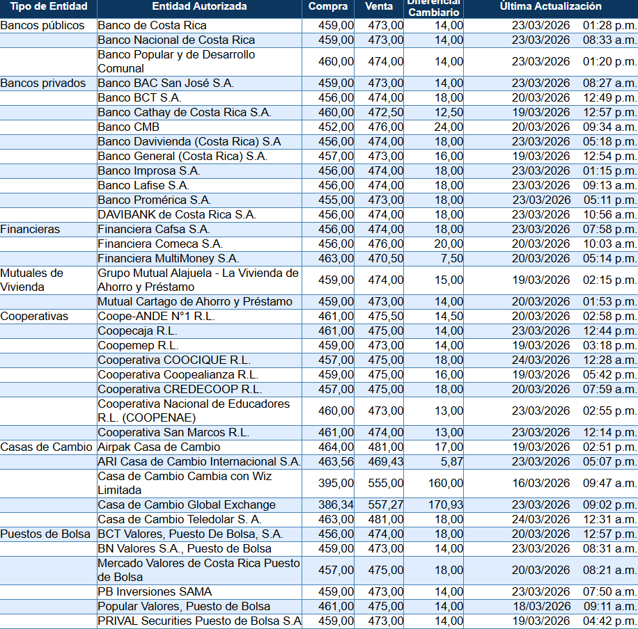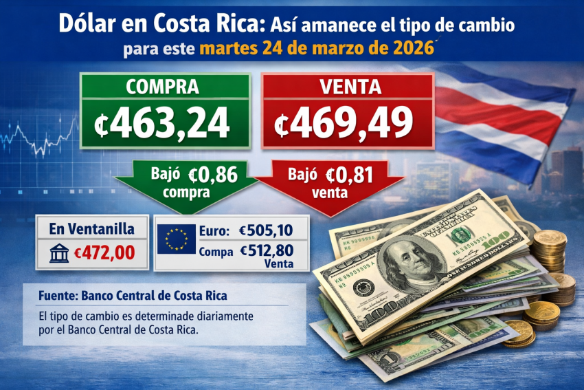 El tipo de cambio del dólar para este martes 24 de marzo de 2026 en Costa Rica se ubicó en ₡463,24 la compra y ₡469,49 la venta, según el Banco Central de Costa Rica (BCCR).