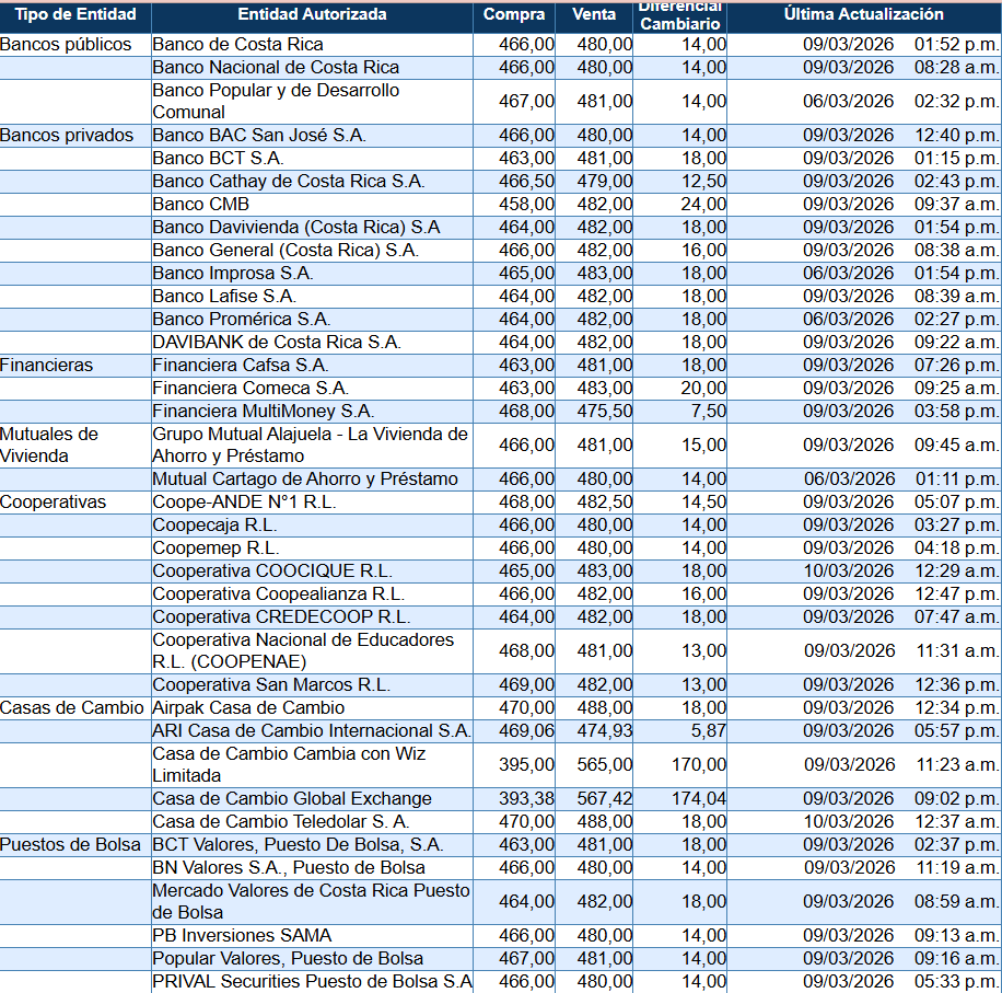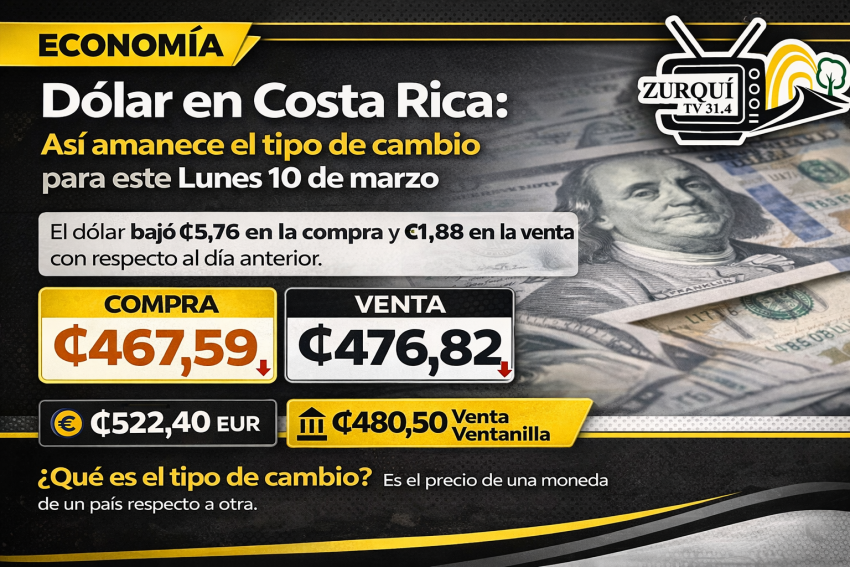 El tipo de cambio del dólar para este 10 de marzo en Costa Rica se ubicó en ₡467,59 la compra y ₡476,82 la venta, según el Banco Central de Costa Rica (BCCR).