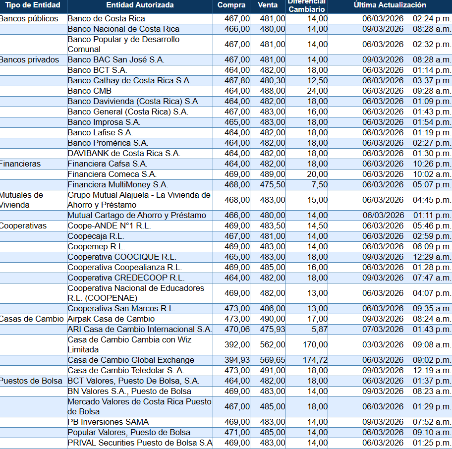 El tipo de cambio del dólar para este 9 de marzo en Costa Rica se ubicó en ₡473,35 la compra y ₡478,70 la venta, según el Banco Central de Costa Rica (BCCR).