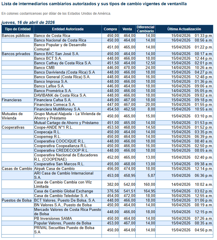 El tipo de cambio del dólar para este jueves 16 de abril en Costa Rica se ubicó en ₡455,54 la compra y ₡460,32 la venta, según el Banco Central de Costa Rica (BCCR).