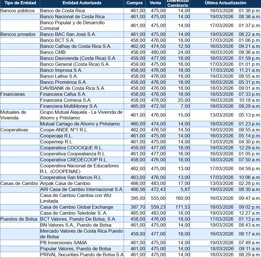 El tipo de cambio del dólar para este 19 de marzo en Costa Rica se ubicó en ₡465,83 la compra y ₡469,94 la venta, según el Banco Central de Costa Rica (BCCR).