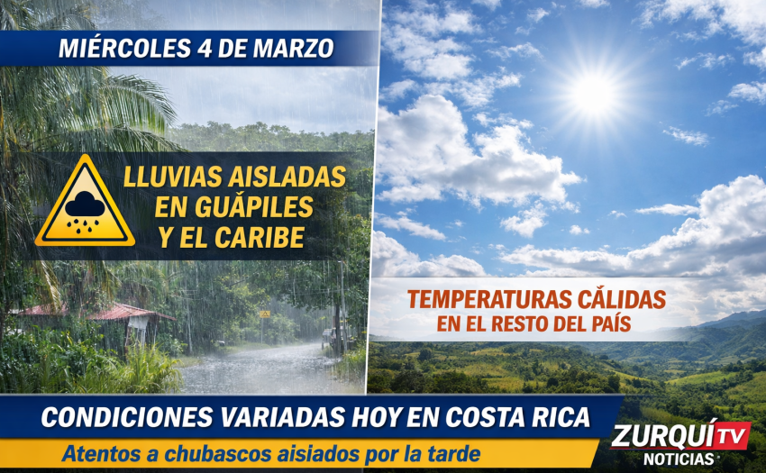 En el Caribe, incluyendo sectores como Guápiles y el cantón de Pococí, se prevé aumento de nubes en el transcurso del día con posibilidad de chubascos muy localizados, especialmente en zonas montañosas. Las temperaturas se mantendrán cálidas y con sensación térmica elevada en horas del mediodía.