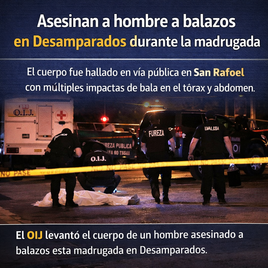 El cuerpo fue hallado en vía pública en San Rafael con múltiples impactos de bala en el tórax y abdomen. Un hombre fue asesinado de varios disparos la madrugada de este jueves en San Rafael de Desamparados, donde fue localizado sin vida sobre la vía pública tras una alerta recibida por la Cruz Roja Costarricense…