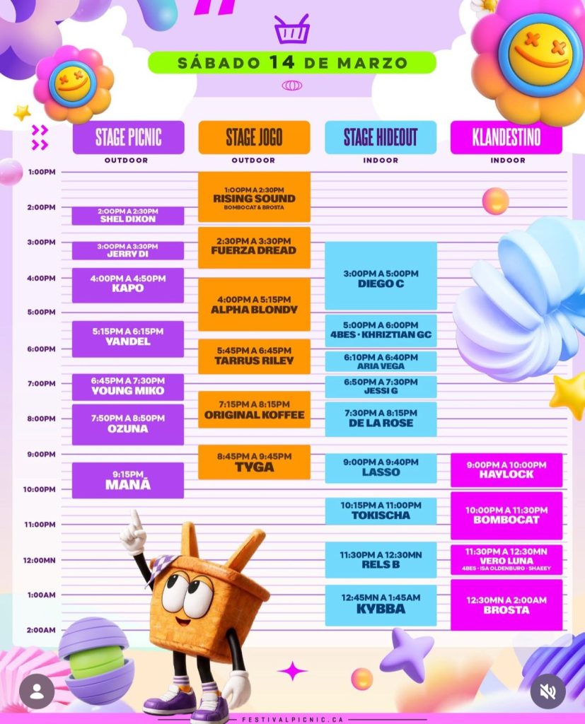 El PICNIC Festival anunció los horarios en los que se presentarán los artistas durante su primera fecha, programada para el sábado 14 de marzo en el Centro de Eventos Pedregal, información divulgada por la organización del evento para que los asistentes puedan planificar su jornada musical.