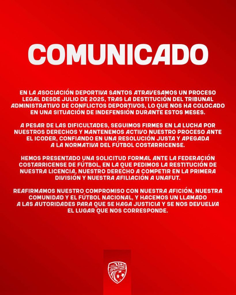 Santos insiste en que busca una resolución que le permita regresar a la máxima categoría del fútbol nacional, en un proceso que mantiene en vilo a la afición guapileña y que podría marcar el futuro inmediato del club en el balompié costarricense.