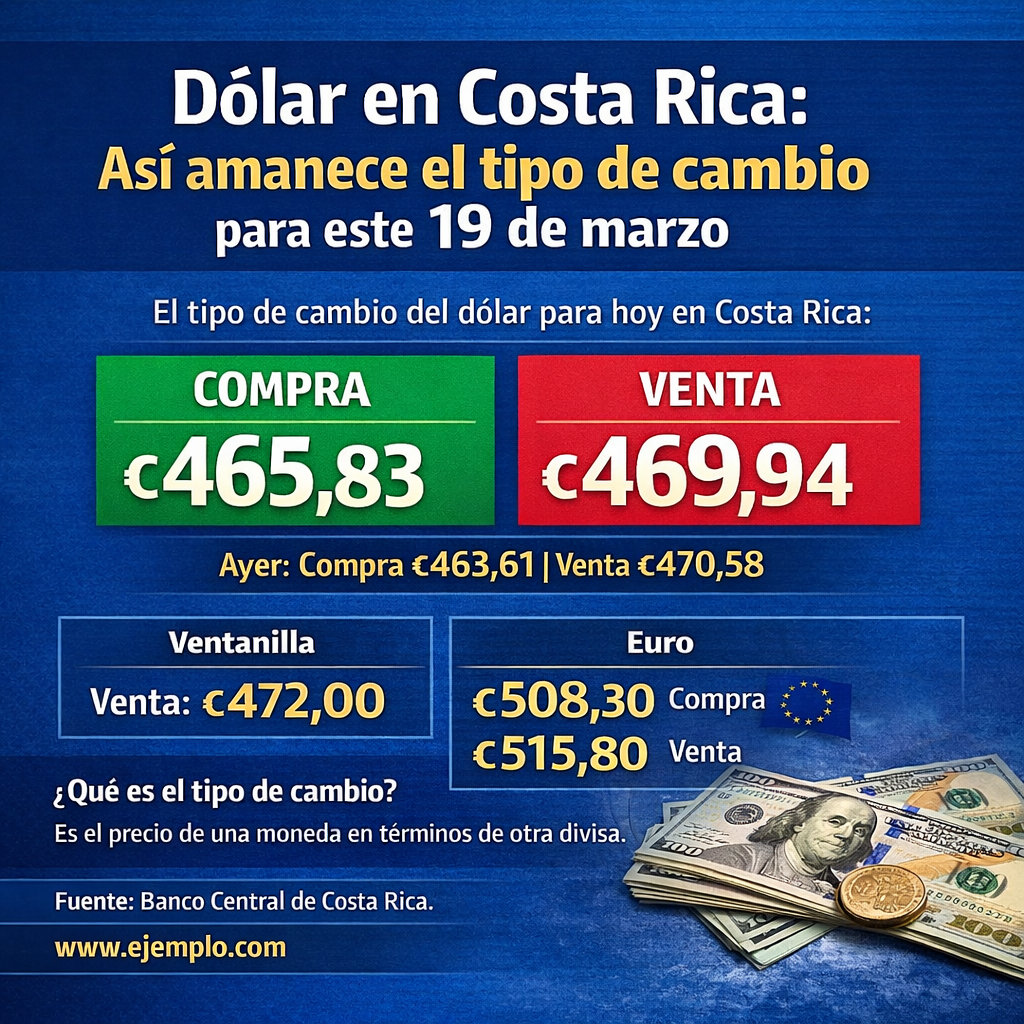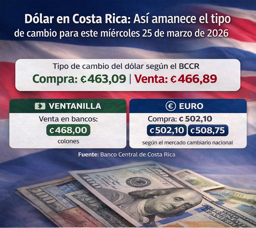 La referencia del Banco Central reporta una ligera baja en el precio del dólar con respecto al día anterior. El tipo de cambio del dólar para este miércoles 25 de marzo de 2026 en Costa Rica se ubicó en ₡463,09 la compra y ₡466,89 la venta, según el Banco Central de Costa Rica (BCCR). En…