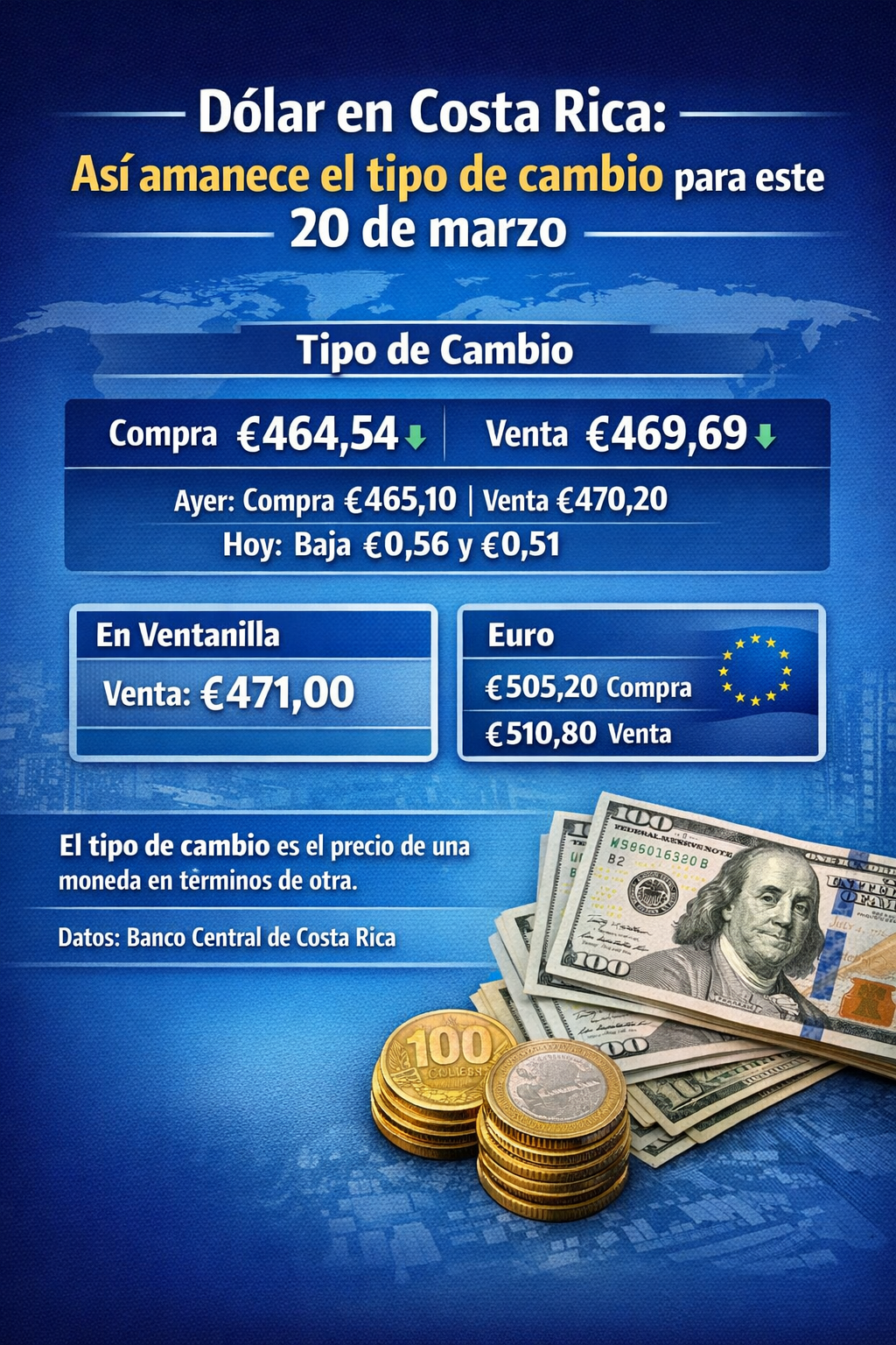 La referencia del Banco Central reporta una ligera baja en el precio del dólar con respecto al día anterior. El tipo de cambio del dólar para este 20 de marzo en Costa Rica se ubicó en ₡464,54 la compra y ₡469,69 la venta, según el Banco Central de Costa Rica (BCCR). En comparación con el…