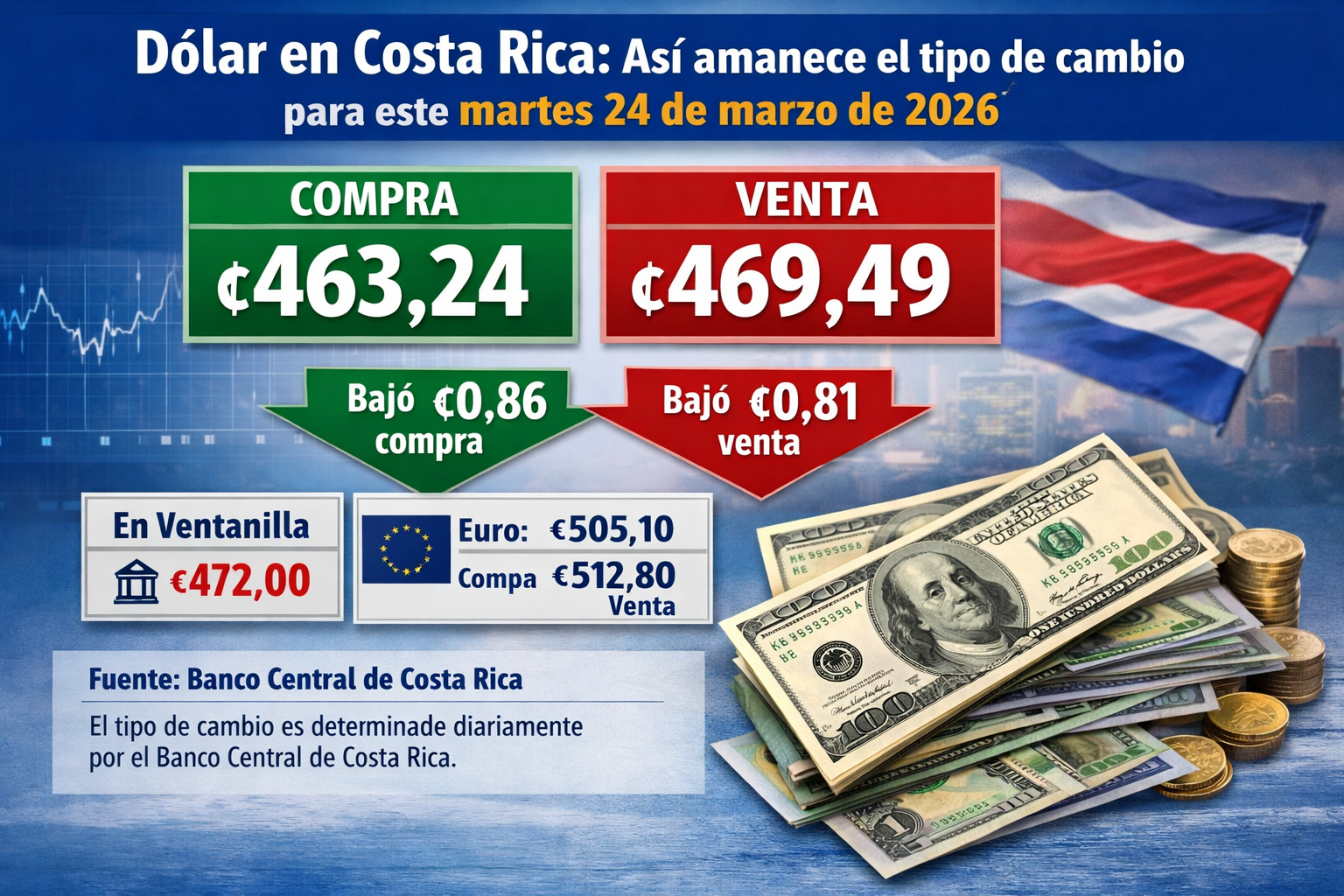 La referencia del Banco Central reporta una ligera baja en el precio del dólar con respecto al día anterior. El tipo de cambio del dólar para este martes 24 de marzo de 2026 en Costa Rica se ubicó en ₡463,24 la compra y ₡469,49 la venta, según el Banco Central de Costa Rica (BCCR). En…