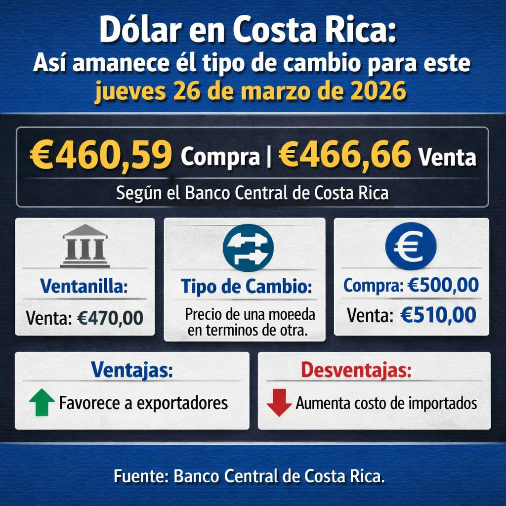La referencia del Banco Central reporta una leve estabilidad en el precio del dólar con respecto al día anterior. El tipo de cambio del dólar para este jueves 26 de marzo de 2026 en Costa Rica se ubicó en ₡460,59 la compra y ₡466,66 la venta, según el Banco Central de Costa Rica (BCCR). En…