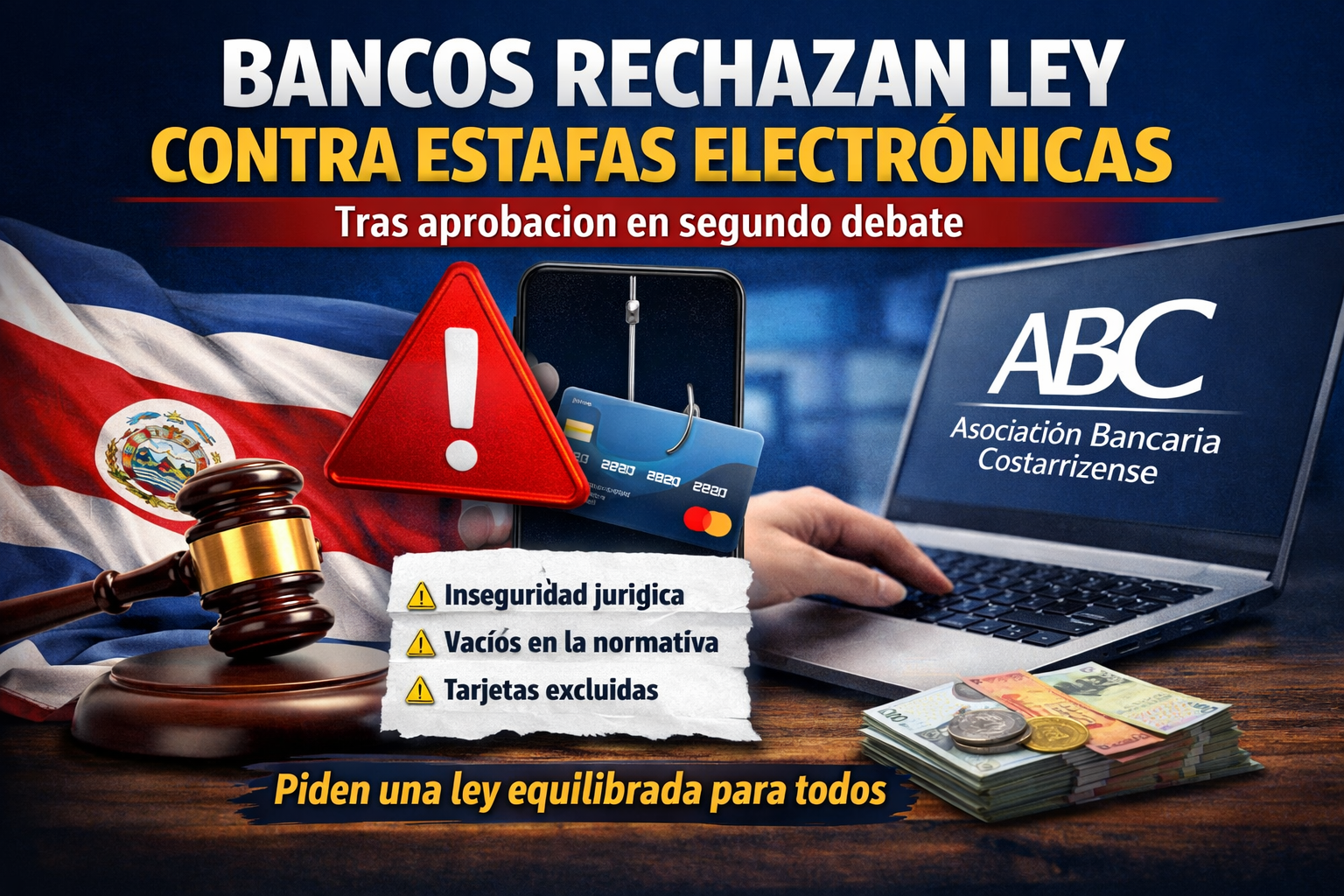 La Asociación Bancaria Costarricense insiste en que la normativa genera inseguridad jurídica y mantiene vacíos en su aplicación La Asociación Bancaria Costarricense (ABC) reiteró este miércoles su rechazo al proyecto de ley contra las estafas electrónicas aprobado en segundo debate en la Asamblea Legislativa, al considerar que la iniciativa podría generar inseguridad jurídica para las…