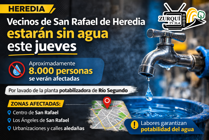 Alrededor de 8.000 vecinos de San Rafael de Heredia se verán afectados por la suspensión del servicio de agua potable este jueves, debido a labores de lavado en la planta potabilizadora de Río Segundo, según informó la Empresa de Servicios Públicos de Heredia (ESPH).